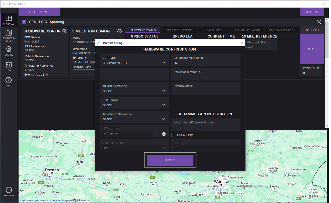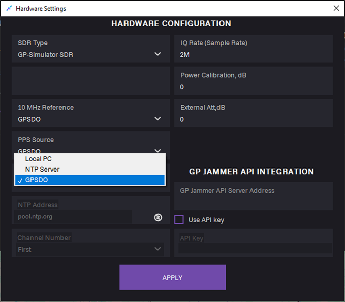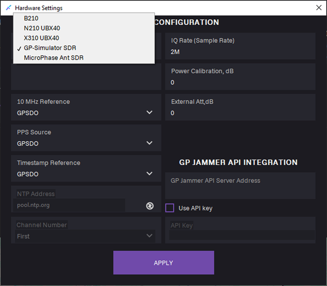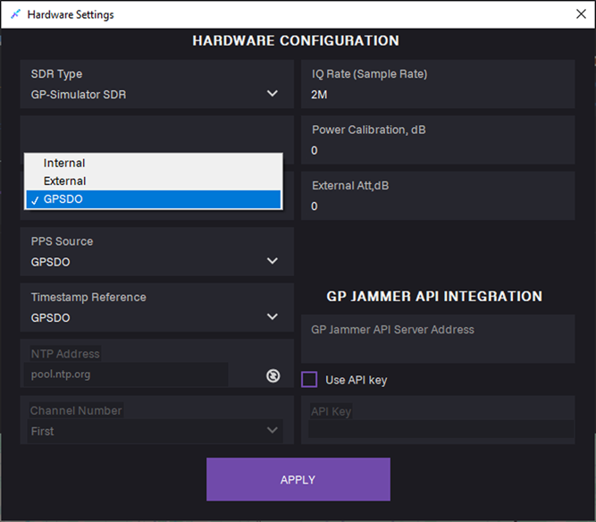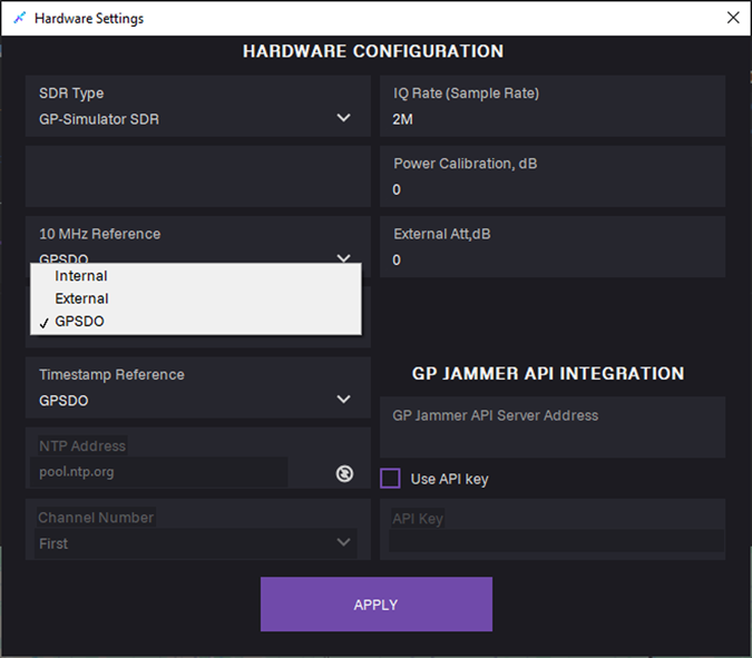 5. In the SDR type field, select GP-Simulator SDR. | 6. In the 10 MHz Reference field, select clock source: