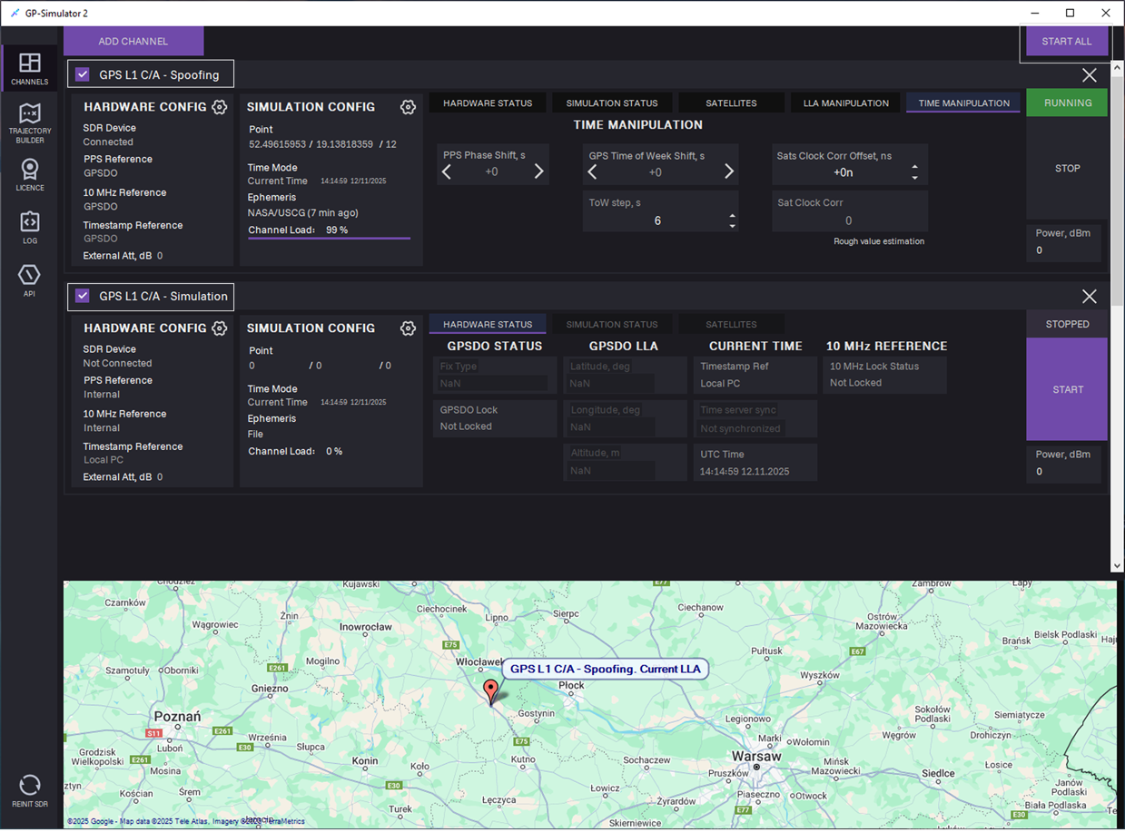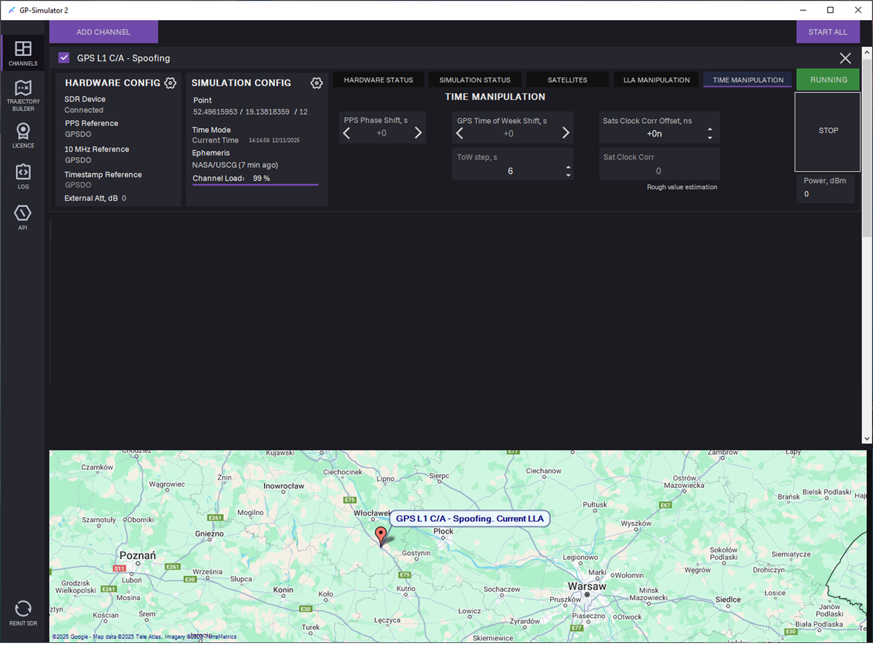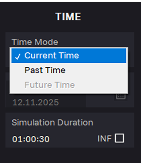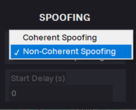 15. In the Time Mode field, select the time period for the simulation from the following options: • Past time: Reproduce historic satellites configuration and timing conditions. • Current time: Simulate GNSS signal based on the real-time system clock. | 16. When selecting Current time generation, SPOOFING section appears. Select spoofing type: