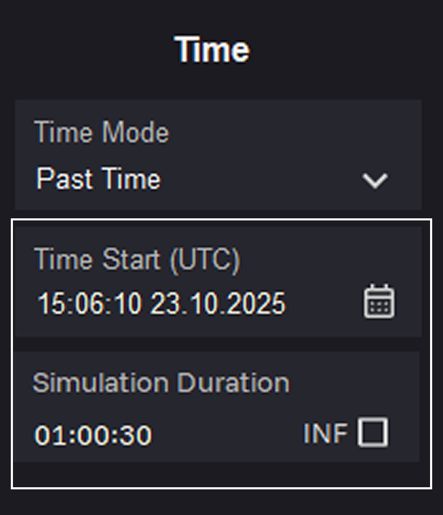 17. When selecting Past time generation, select the simulation start date and time in UTC in the Time Start (UTC) field. After each change to the Time mode and Time Start (UTC) parameters, you must download the latest almanac and ephemeris files. 18. Enter time in the Simulation Duration field. Select the INF check box, to upload new ephemeris automatically. | ||