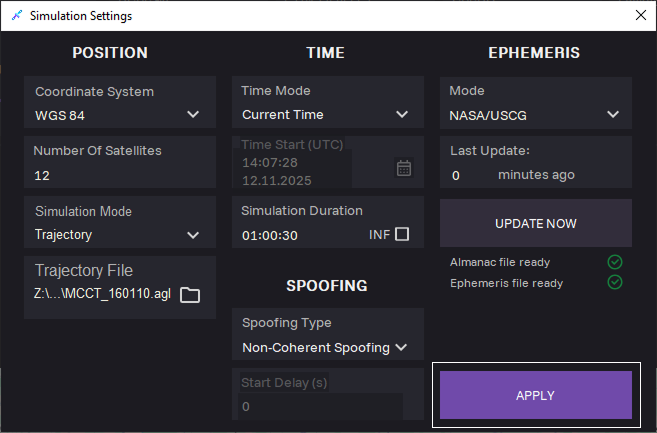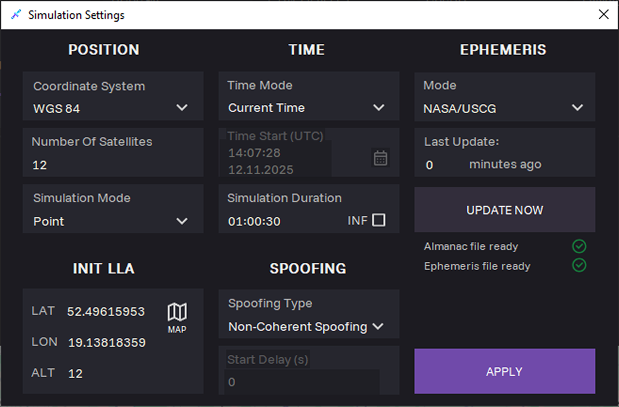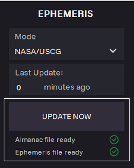 Mode: Field where source of almanac and ephemeris is shown. Last Update: Time of the last update almanac and ephemeris data. 19. Click UPDATE NOW to download actual data for the selected simulation Time Start (UTC). | ||