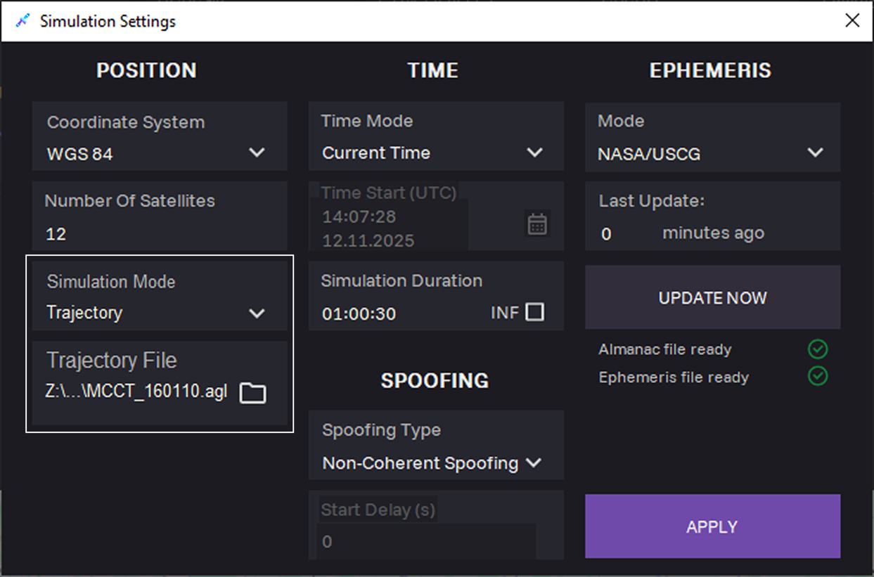 14. When selecting Trajectory simulation mode, upload a file describing the object's trajectory in TRJ format in the Trajectory File field. To obtain a file with a simulated trajectory, go to the TRAJECTORY BUILDER tab.