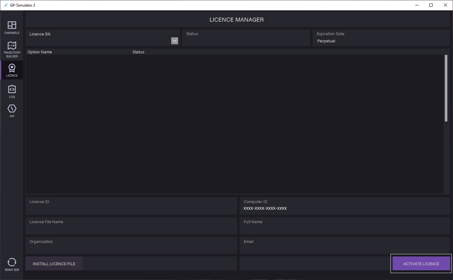 3. On the LICENCE tab, click ACTIVATE LICENCE. GP-Simulator License Registration dialog opens.